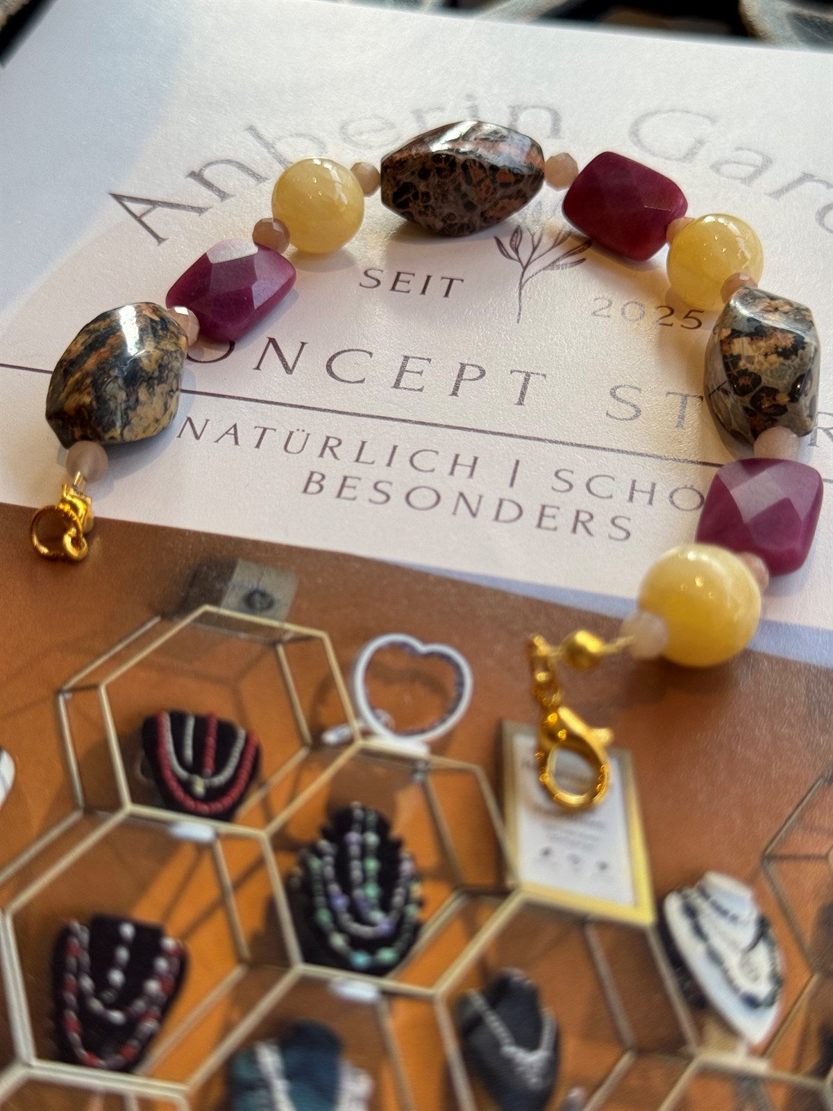 LEONARDEN JASPIS - HONIG CALCIT - RUBIN - SONNENSTEIN ARMBAND ca 20 cm - UNICAT