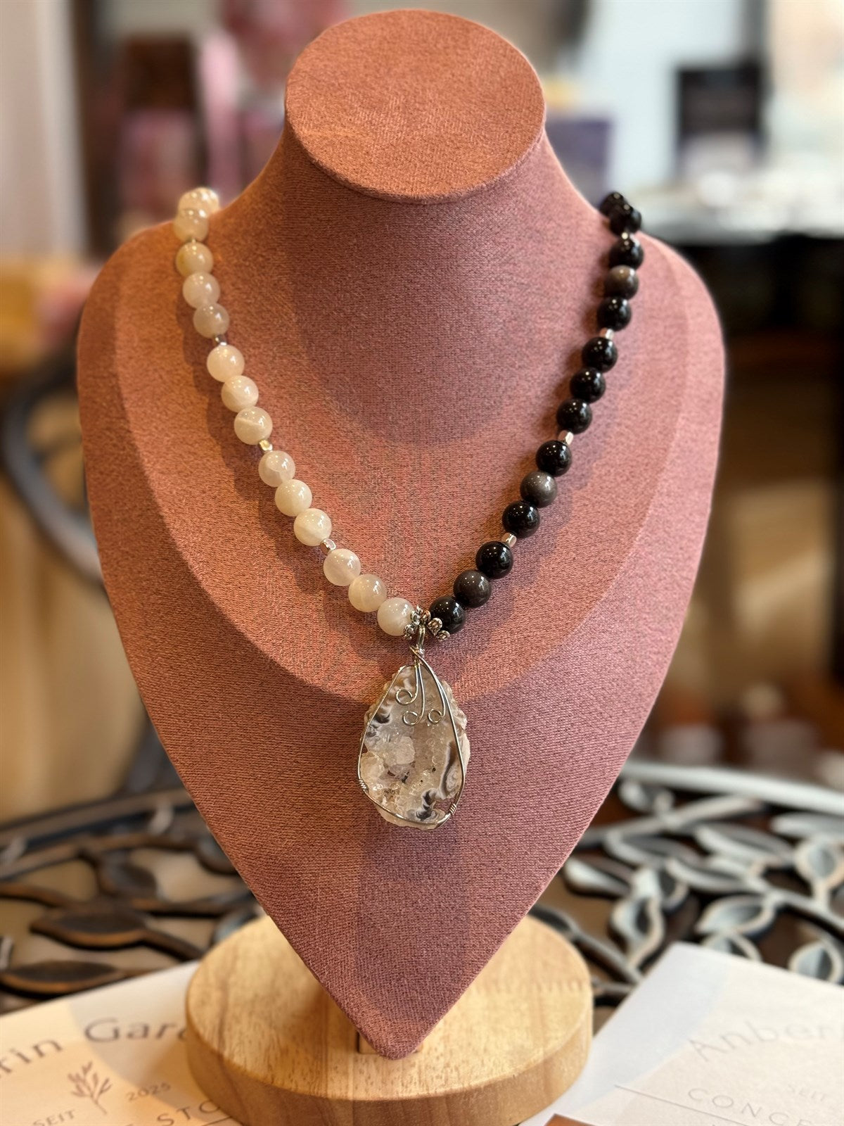 OBSIDIAN -CALCIT MIT ACHAT ANHÄNGER HALSKETTE ca 73 cm - UNICAT