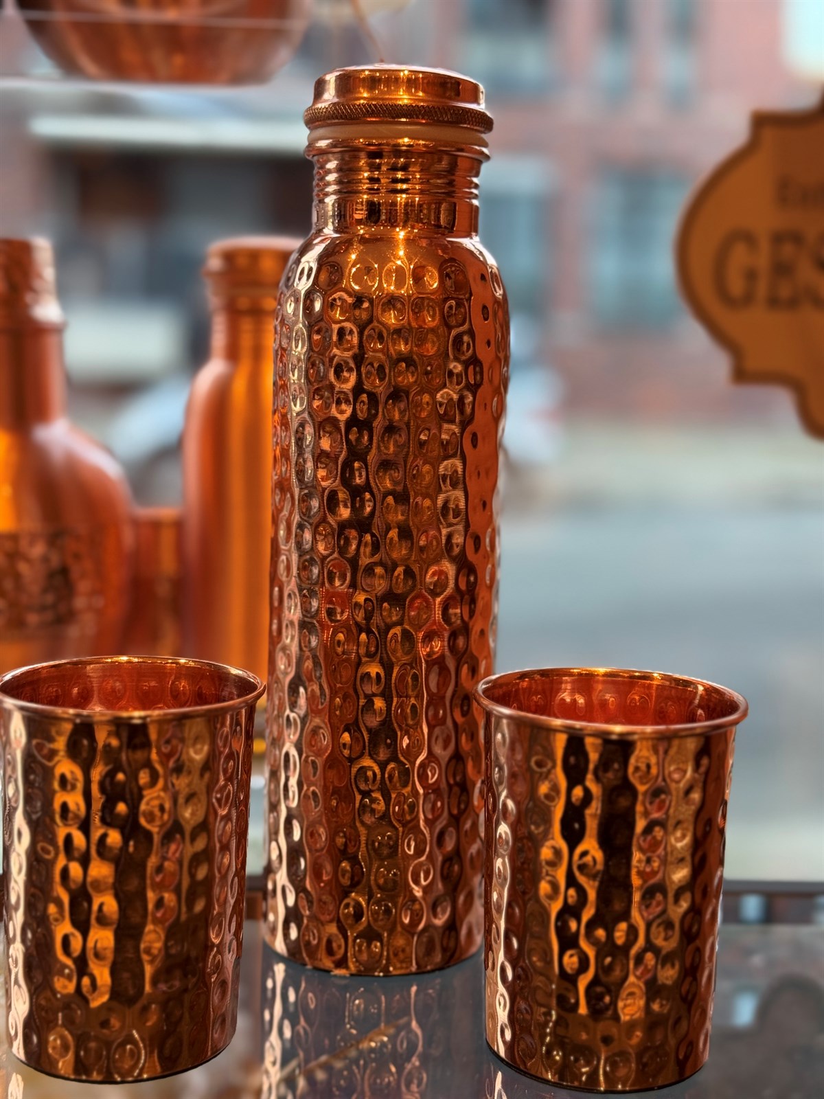 Reines Kupferset mit klassischer gehämmerter/gepunkteter Flasche und 2 Bechern (in einer Geschenkbox aus Samt)