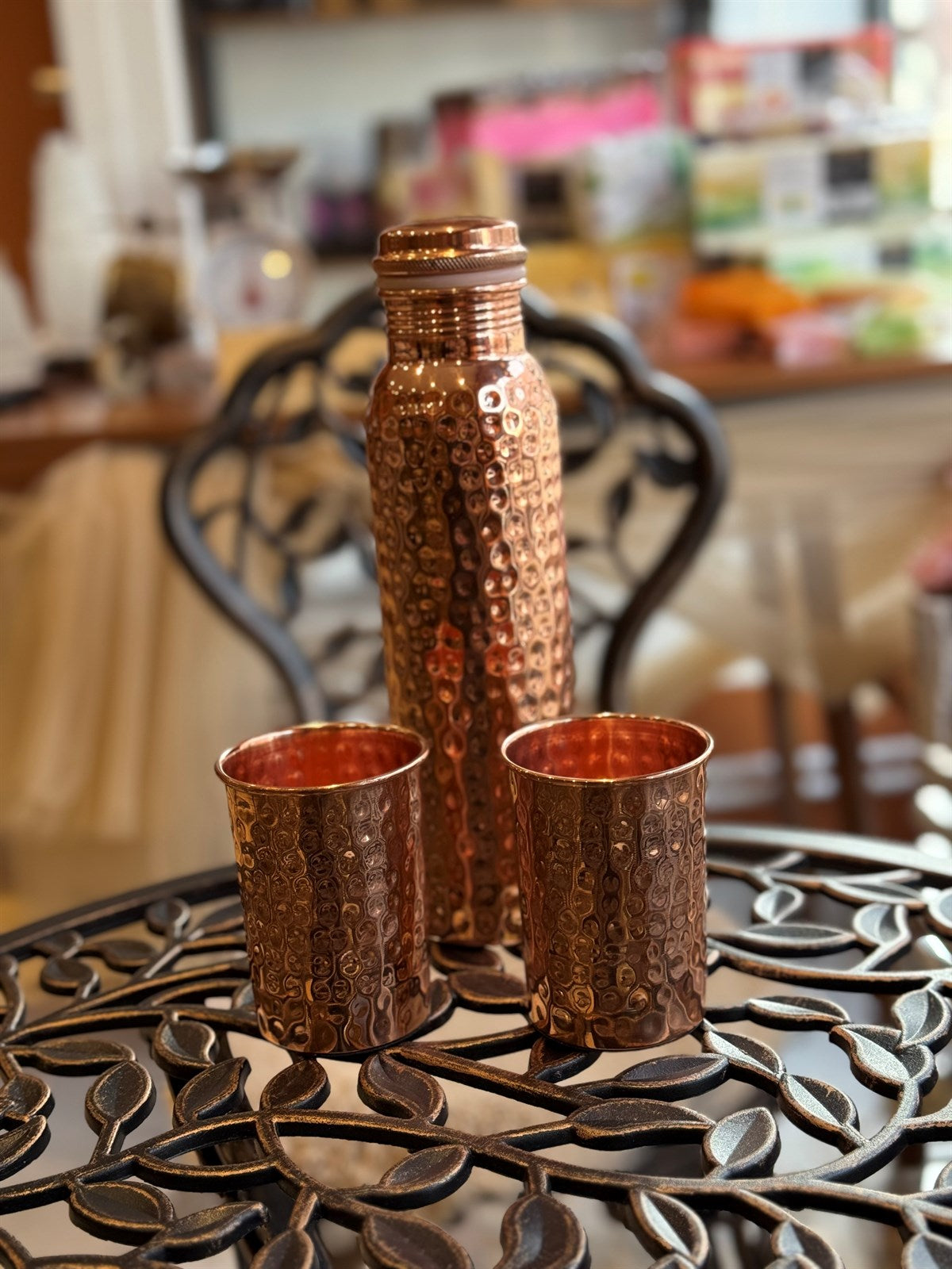 Reines Kupferset aus gehämmerter Flasche mit 2 Bechern ± 950 ml (in Samt-Geschenkbox)