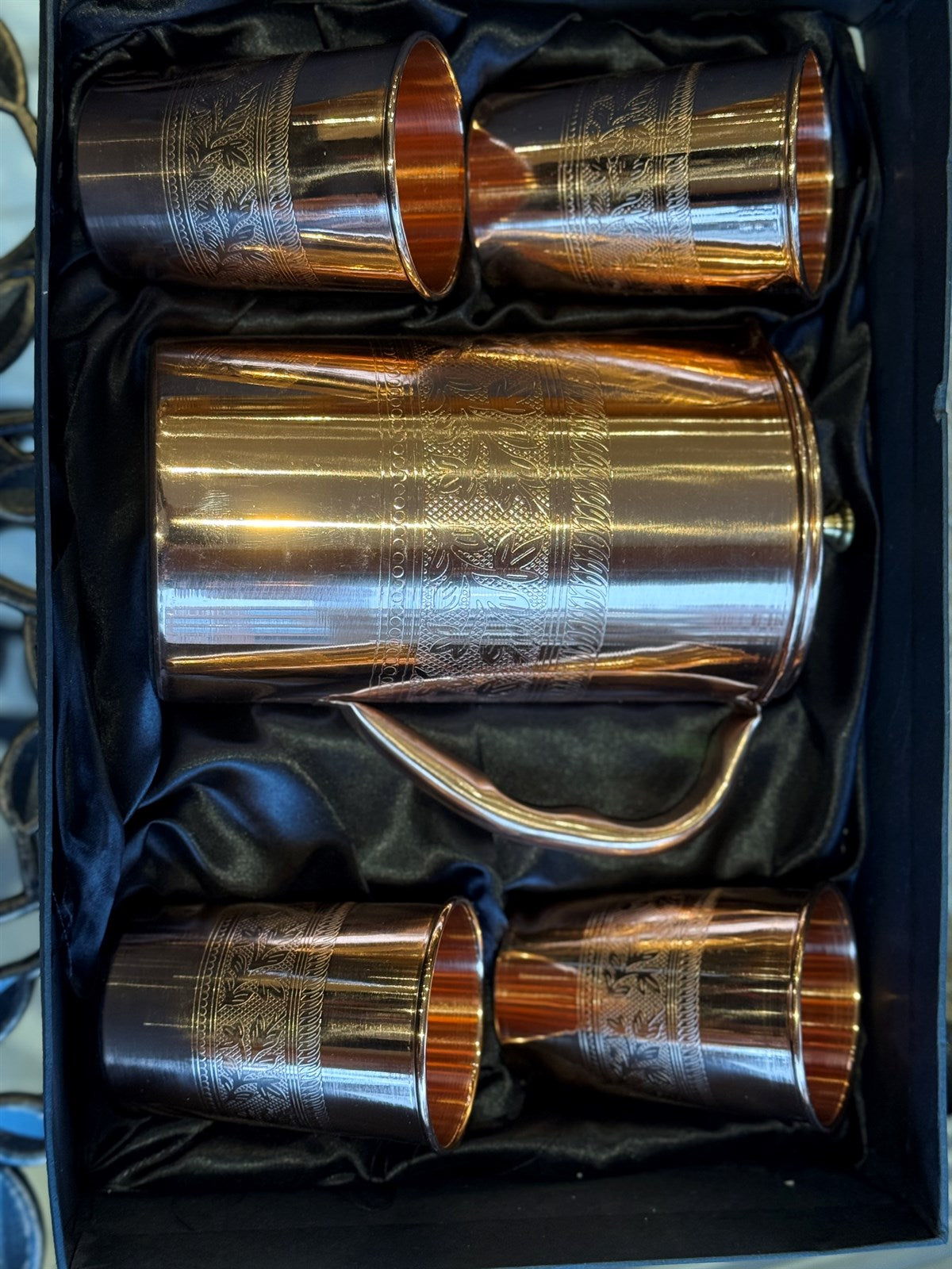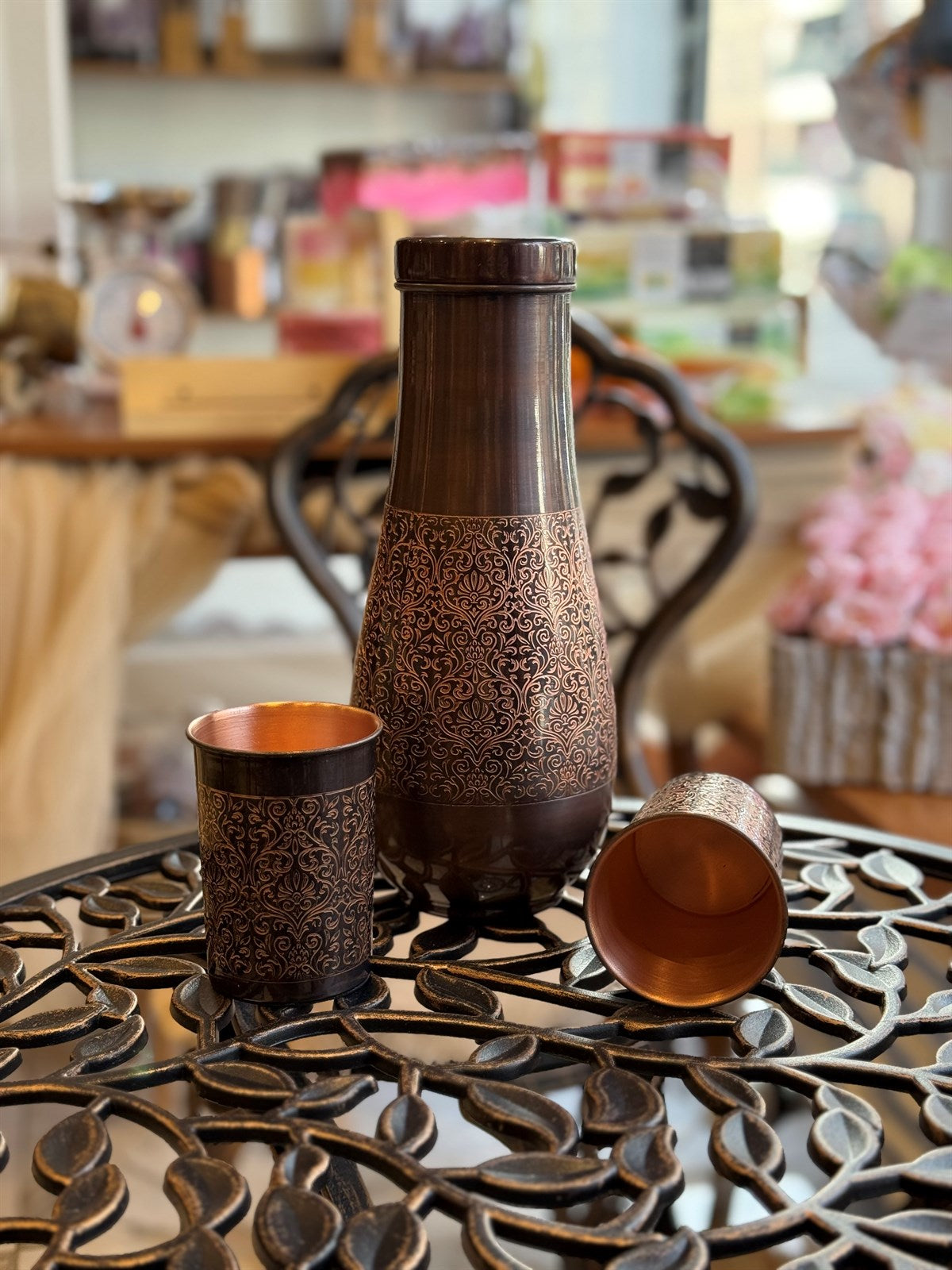 Reine Kupferkaraffe mit 2 gläser, antik geätzt, mit Kappe – hoch und schmal, ± 950 ml