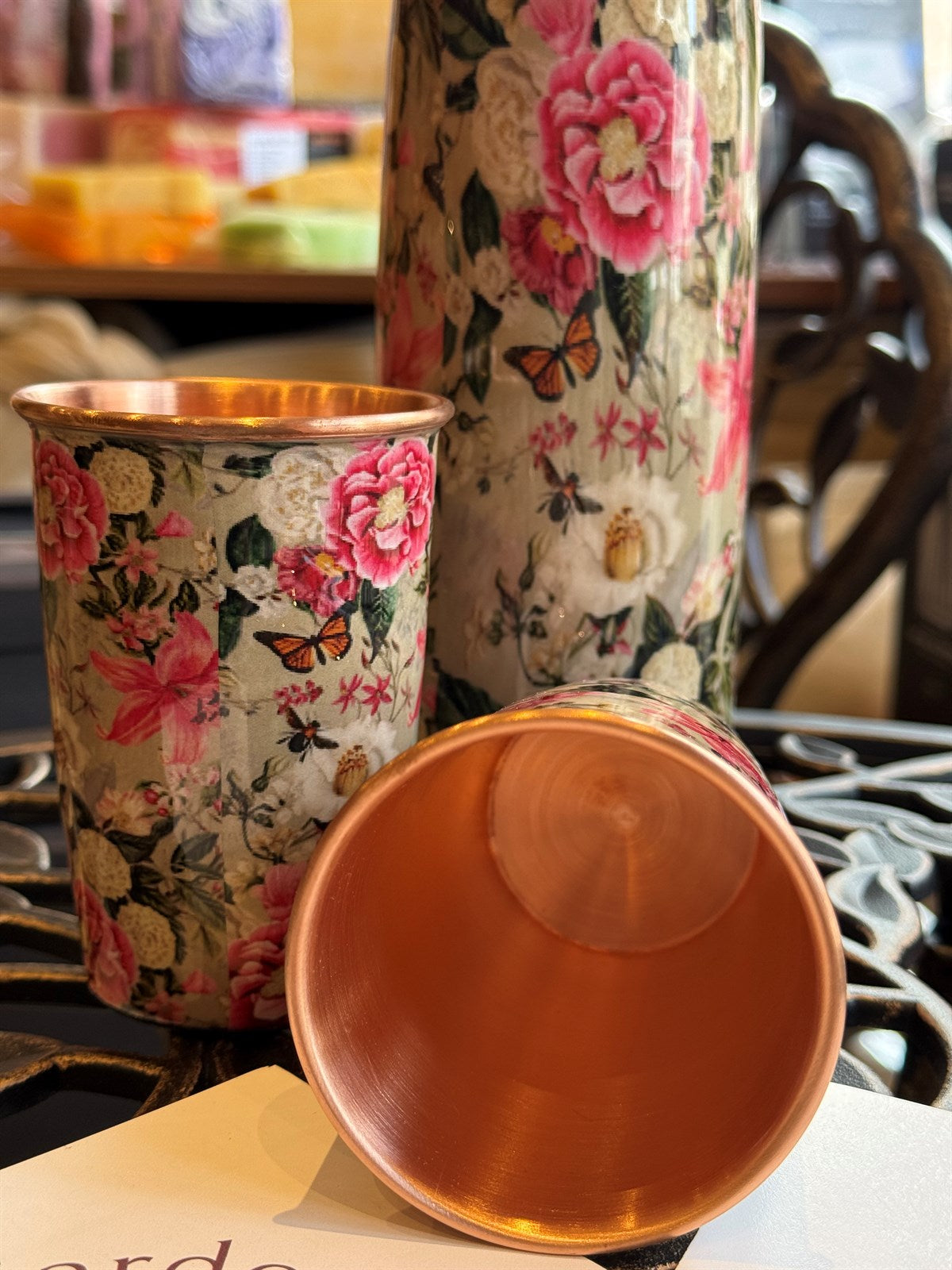 Wasserflasche aus reinem Kupfer mit Blumendruck in Grün/Rosa/Weiß, ± 950 ml (Heavy Duty)