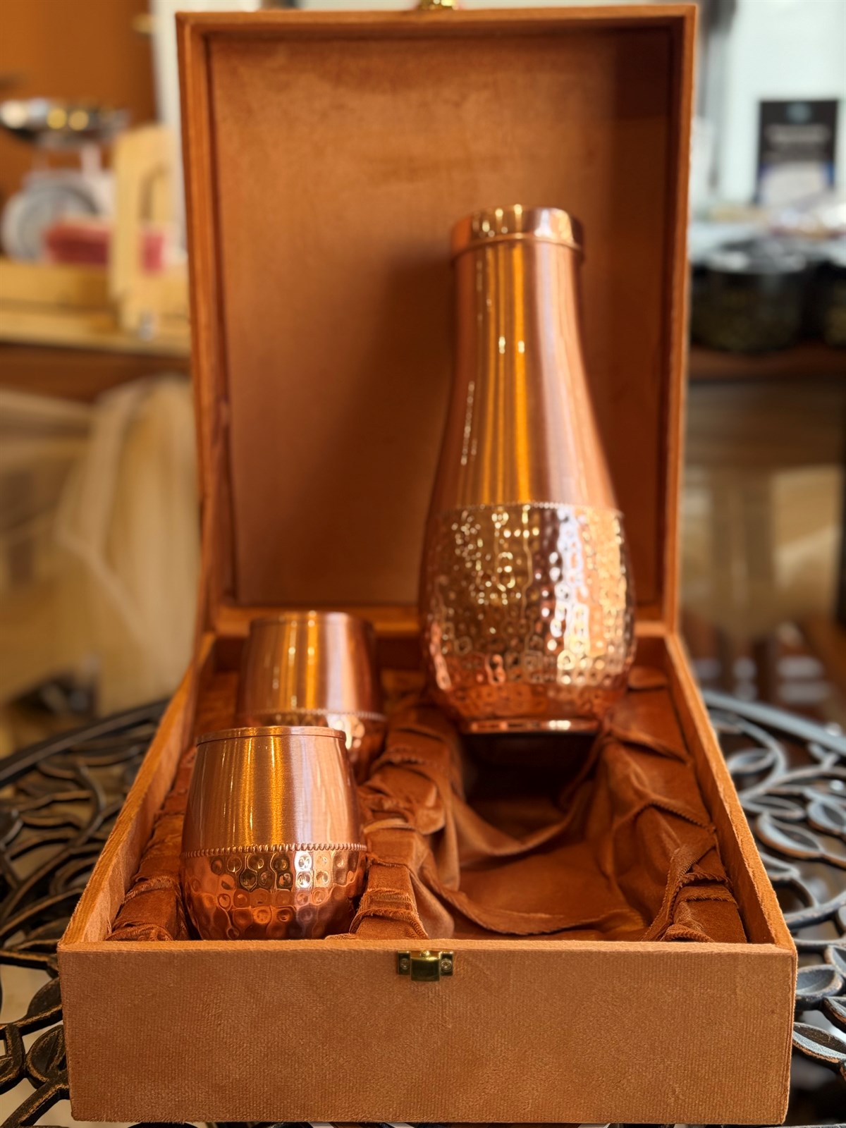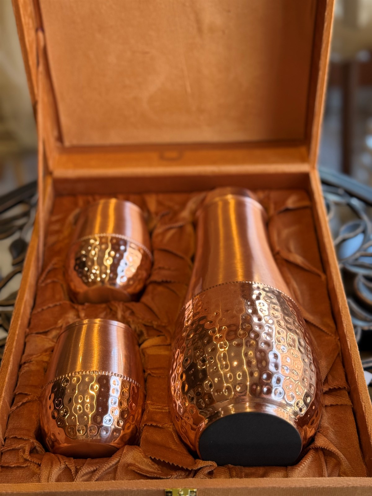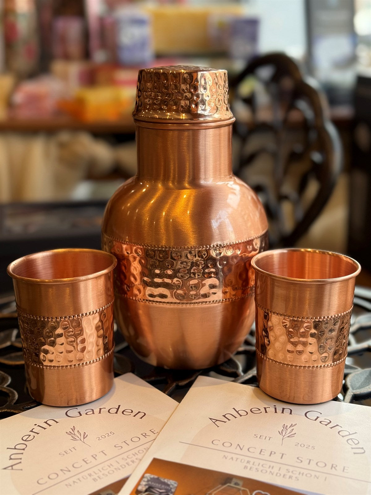 Kupferset aus gehämmerter, tropfenförmiger Karaffe aus reinem Kupfer, ± 950 ml, mit 2 Tassen