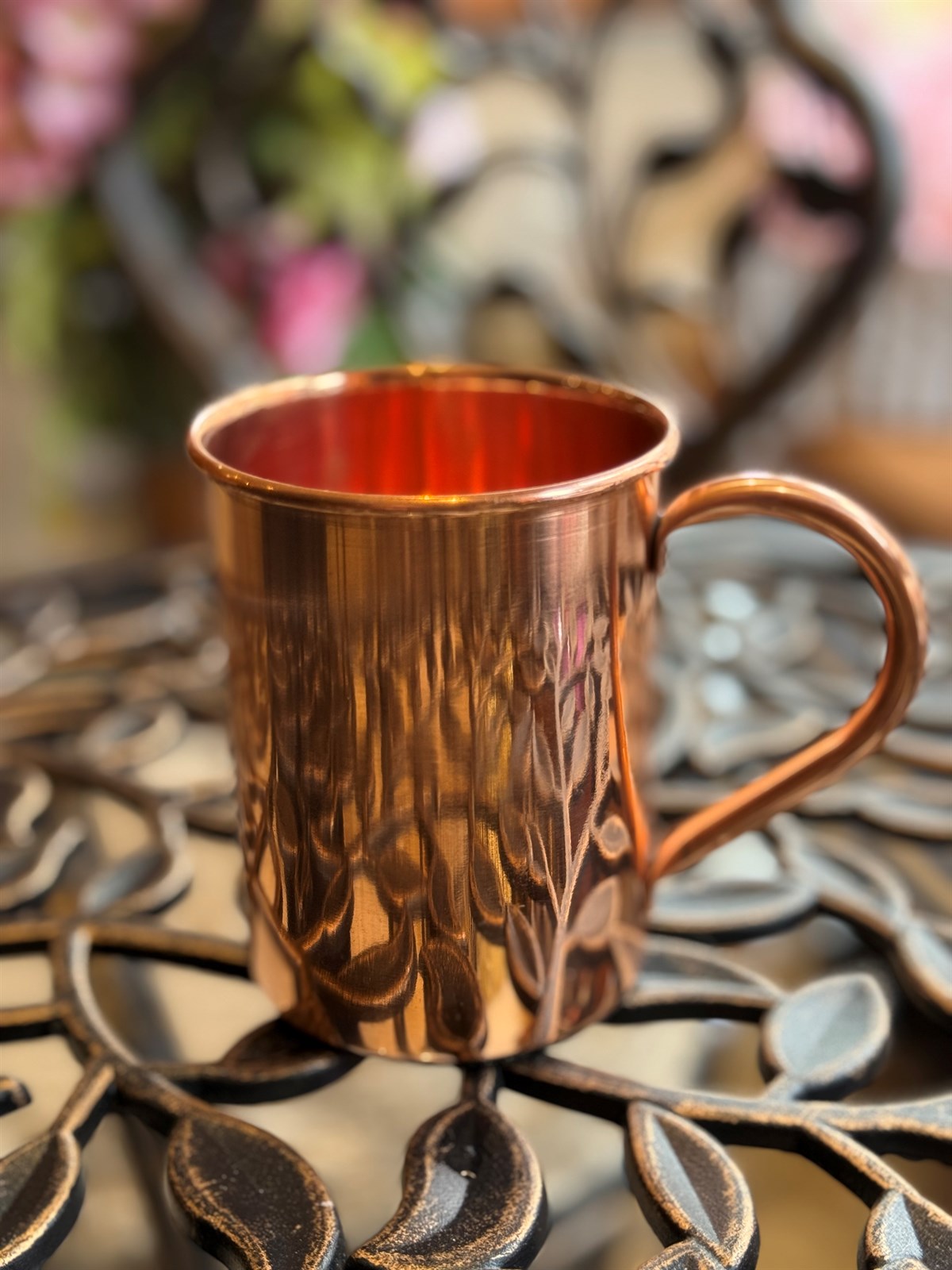 Krug aus reinem Kupfer mit eingraviertem Blumenmuster, ± 1,5 Liter