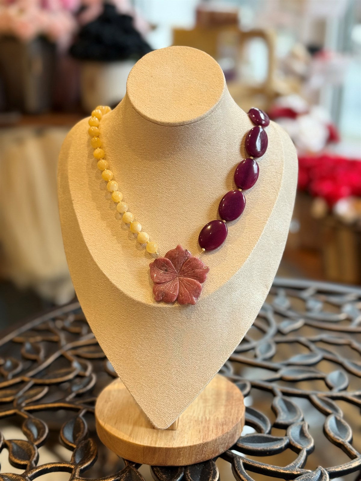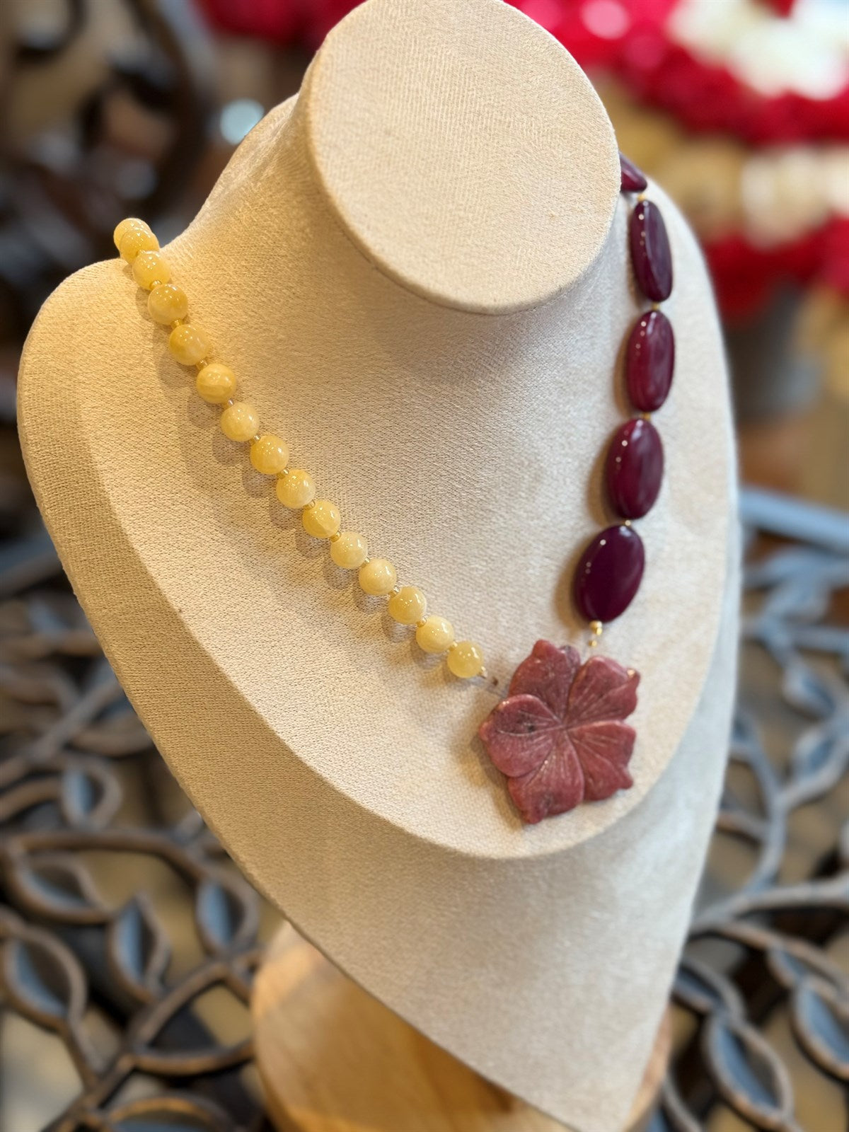GELBE JADE - LILA JADE - RHODONITE HALSKETTE ca 55 cm - UNICAT