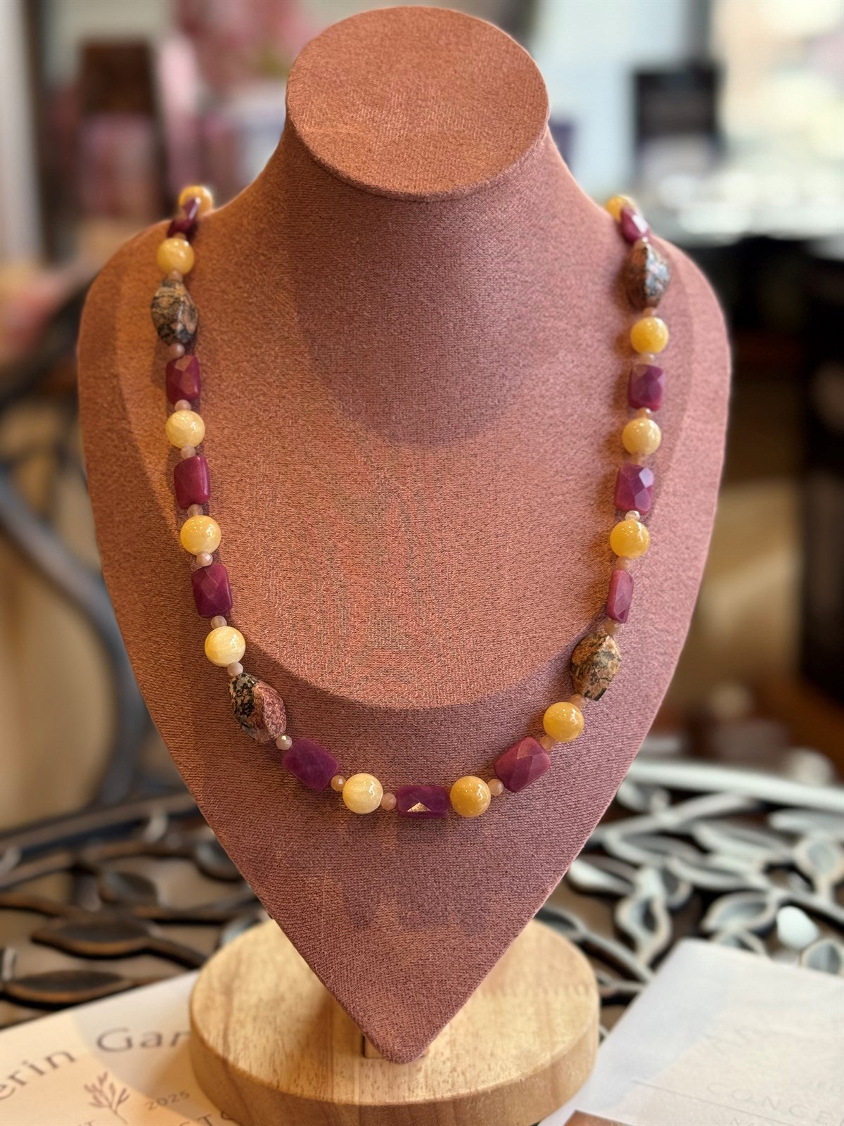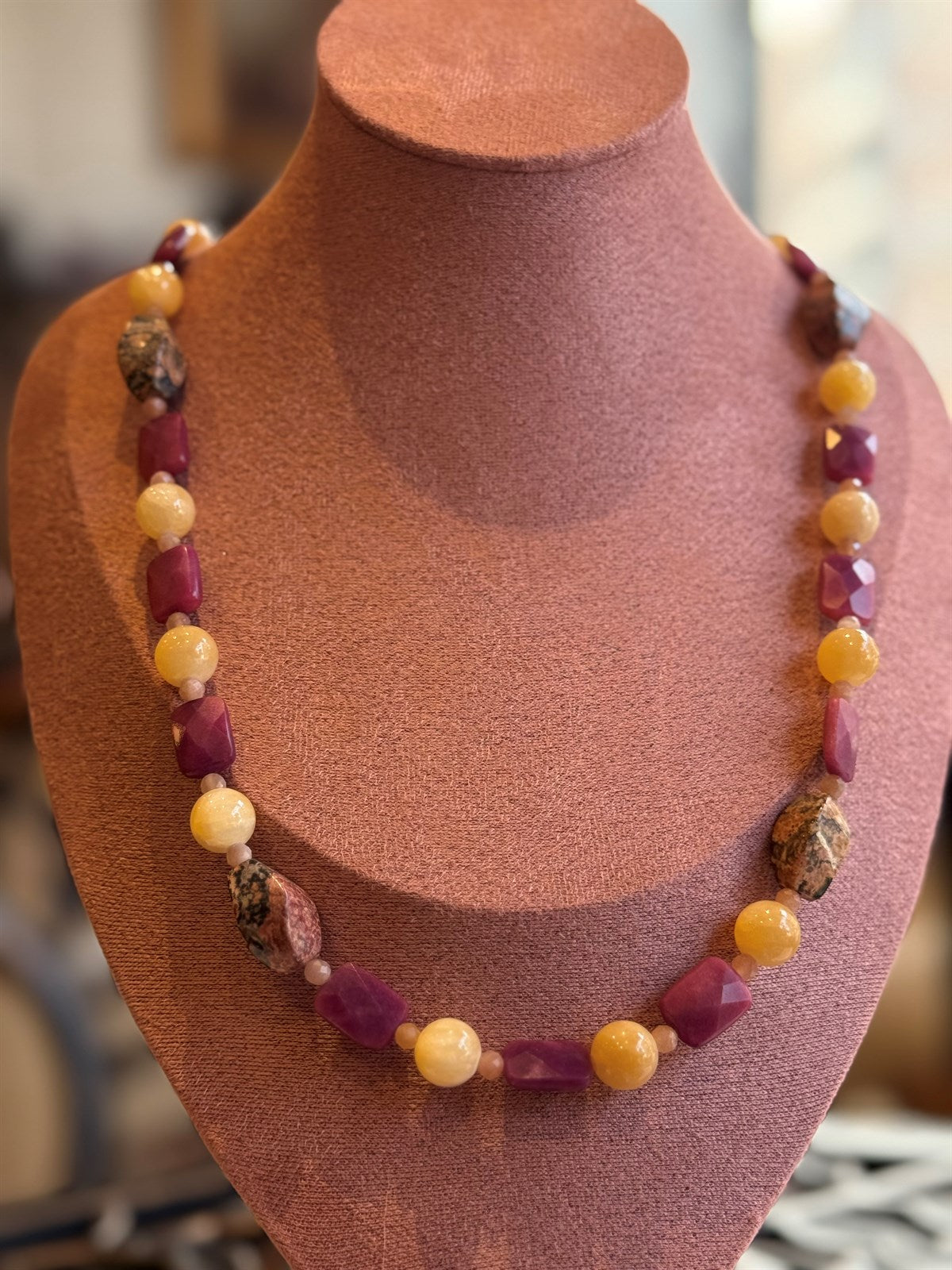 LEOPAERDEN JASPIS - HONIG CALCIT - RUBIN - SONNENSTEIN HALSKETTE ca 93 cm - UNICAT