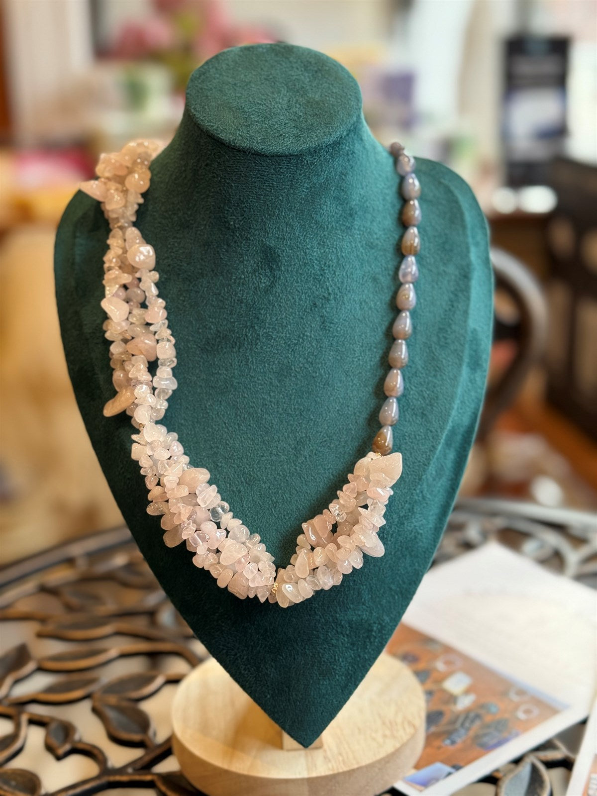 ROSENQUARZ - BLAUER ACHAT - SILBER HALSKETTE ca 77cm - UNICAT