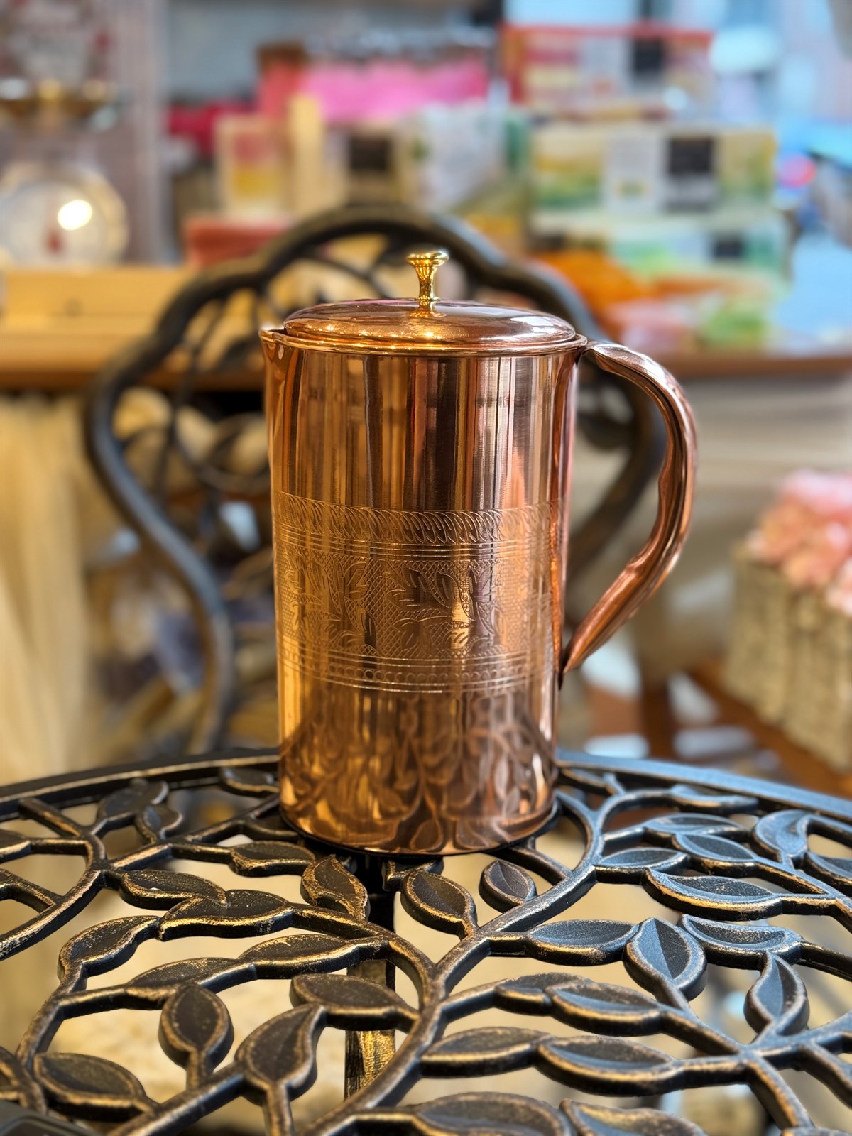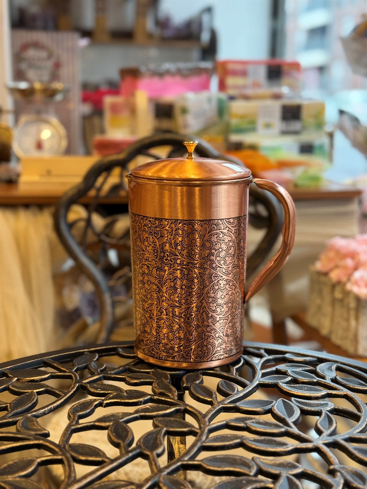 Krug aus reinem Kupfer mit Blumenmusterrand und Deckel ± 2 Liter (735 gr)