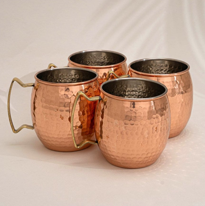 4er-Set Krüge/Bierkrüge aus reinem Kupfer gehämmert mit Henkel - Innenseite Nickel - 4 x 400 ml